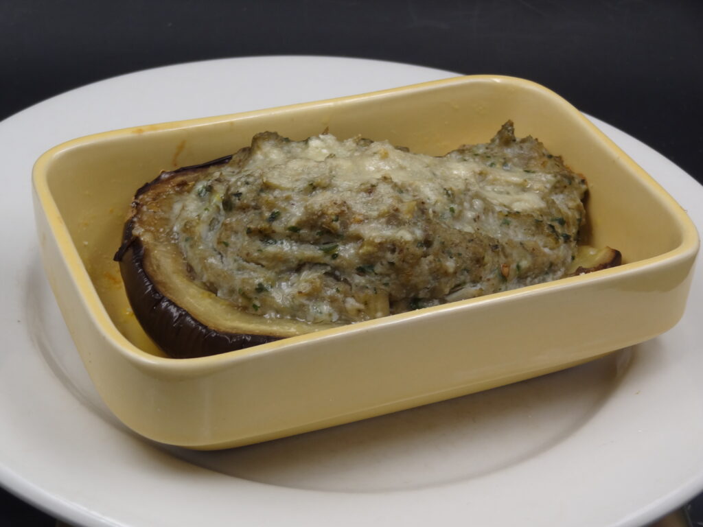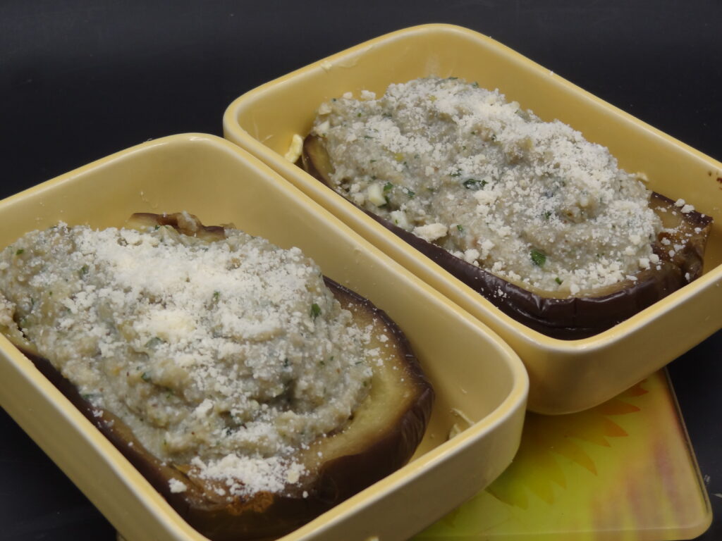 Farcir la coque des aubergines avec la préparation précédente.