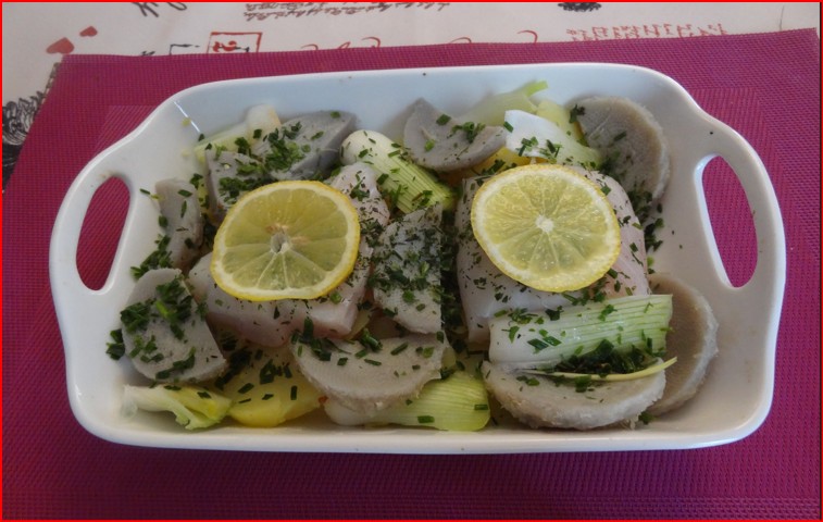 Cabillaud à la bretonne pour 2 personnes et 5 sp vert -4 spl bleu – 2 spv violet – 2 psp par part